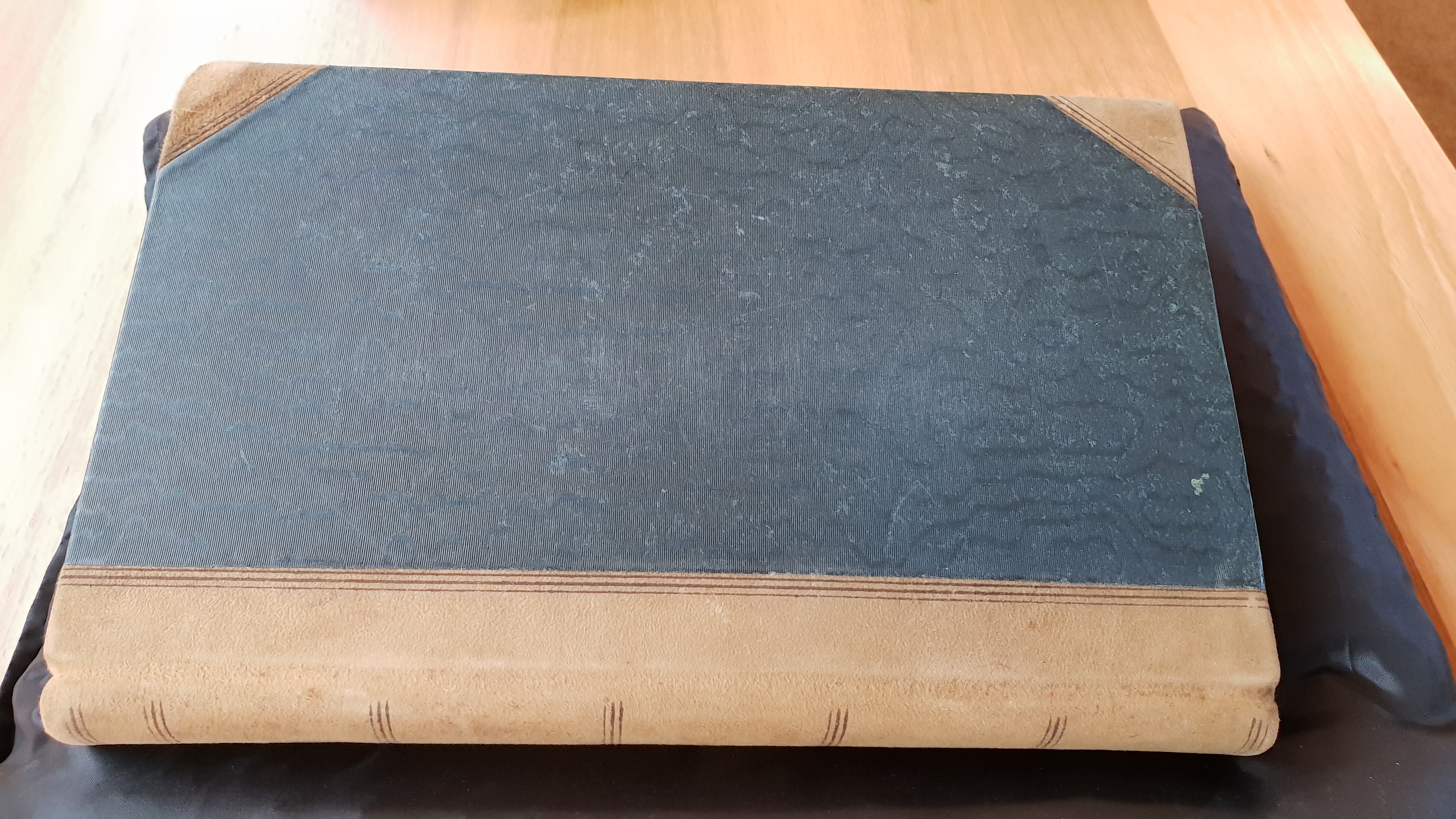 Now we come to the manuscript. I half expected it to be some loose bound pages in a folio sleeve, huh! Out comes a big satin bean bag cushion and gloves and a very pensive glowering Librarian instructing me on how to handle the manuscript. He delivers to me a large grey box with a number of different manuscripts housed together. Taking up most of the space was this huge tome of a thing that looked like it was straight from the set of “Gringotts” in “Harry Potter”.