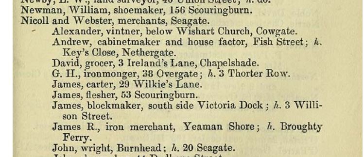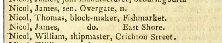 1809! The age of these records and the fact that they are so readily available is phenomenal. The Fifh-market as you can see from the map below runs off the Green market. From my reading it is also known as Shore Terrace. All the listings in the Dundee Directory that I have been able to find place the Nicoll businesses around this area, Green market, East Shore and King William 4th Dock.