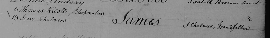 George, doesn’t actually refer to his “…Grandmother Nicoll” by name, so we now know that she was Jean Chalmers and her Father who was Butler to the Earl of Strathmore, was, James Chalmers, who George’s Father was named for. Isn’t that just brilliant. (That’s rhetorical by the way.)