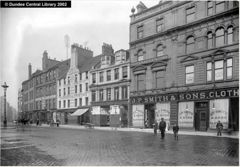 I can’t find a specific date for this photo, but I’m guesstimating it is in the 1890’s sometime. Campbell’s Close is the entrance way just to the left of the J in J.P Smith sign. Interesting note, you can just make out the writing on the top rim of the building it says, “The Garden”, this is reputed to be Dundee’s first full vegetarian restaurant. (I would credit this info but I can’t remember or find where I read this, flying by the seat of my pants people!)