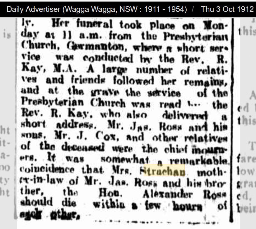 A Christina, last name Strachan, death 1912 in Germanton, not Little Billabong but right locale and Parents names listed and they matched with my Christina.