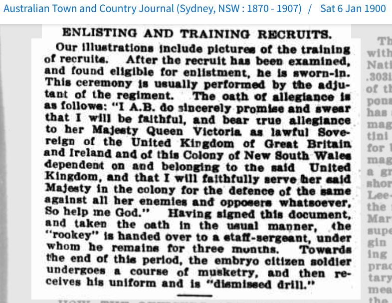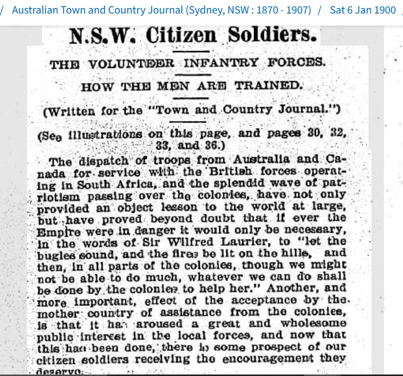 I think it is a good idea first, to put up some context, just to help us pin where this information sits in George’s timeline. Of course, we are talking about some type of military service, in case you didn’t read the fine print in question 11 of George’s attestation paper above. A quick reminder, George was born in 1879. In 1899 when the Boer War starts in South Africa he is 20 years of age. At the time we are still a collection of Colonies not yet federated. In relation to the history of the defense of Australia by the British, from the time of invasion in 1788 until 1870, Australia had been garrisoned by British Troops. From 1870/71 the colony was without regular troops, its defense being entirely in the hands of the regular and volunteer forces around the colonies.(https://trove.nla.gov.au/newspaper/article/71374239)