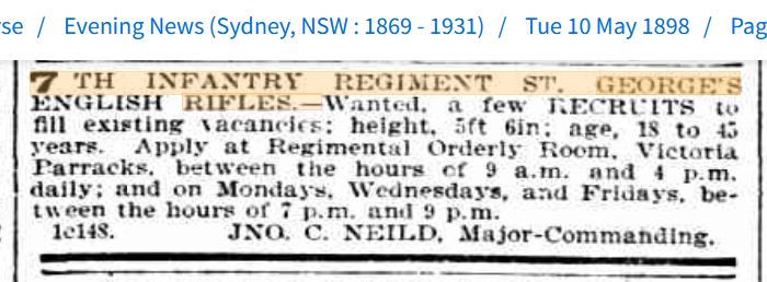 There is no way to be certain but with no age restrictions, I wonder if George joined the Corps at this early stage, or did he wait another year until he was 18? There must have been some change in the thinking in relation to who was enlisting as there were some restrictions that came in to play evident in this later notice from 1898.