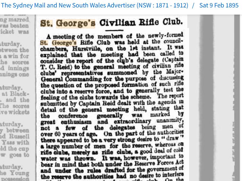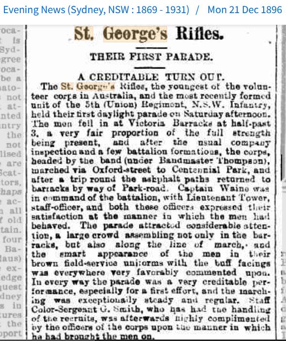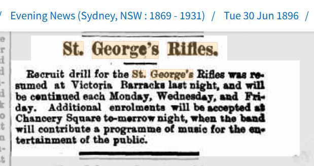 George is 15 years old at this stage, turning 16 in June of 1895. The next mention I can find of this reserve force is in April 1896. Not to confuse you too much but the article above coincidentally is discussing the issue of feeding into a reserve force and it just happens to be that the organisation they are discussing is called the St. Georges Rifle Club after the area of Sydney it was formed in. The St. George’s Rifle regiment that our George joins and discussed in the article below, is named for the patron Saint of England, chosen by King Edward III in 1350. (https://www.bristolpost.co.uk/news/uk-world-news/st-georges-day-2019-why-2787321)