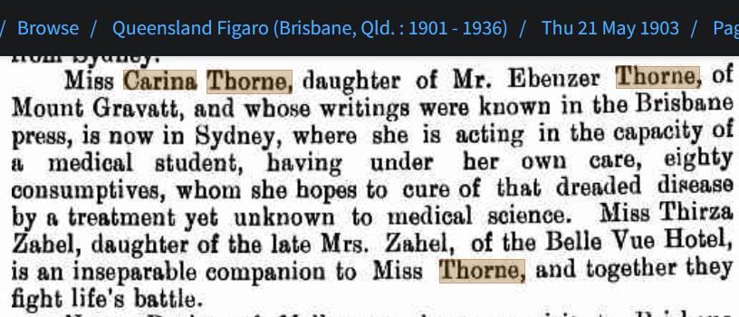 I’m referring to an amazingly inspirational women named “Kate Carina May Thorne”. She married my 1st Cousin 3x removed in 1903 and became “Mrs George Alfred Nicoll” after that. She was a Poetess, Author, Playwright and Doctor. She apparently developed a new treatment for “consumptive diseases” not long after marrying George and received a huge amount of notoriety which is evident when you do a quick search on National Library’s Trove sight.