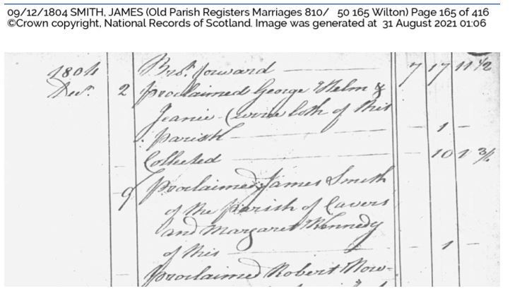 Another aside for you, and turning our attention back to the map of Hawick, Figure 7 above. If you look to the top of the map, to the next town listed, Wilton. This is where Margaret’s parent’s marriage banns were proclaimed in 1804. I’m amazed, but I found a record of their wedding banns.