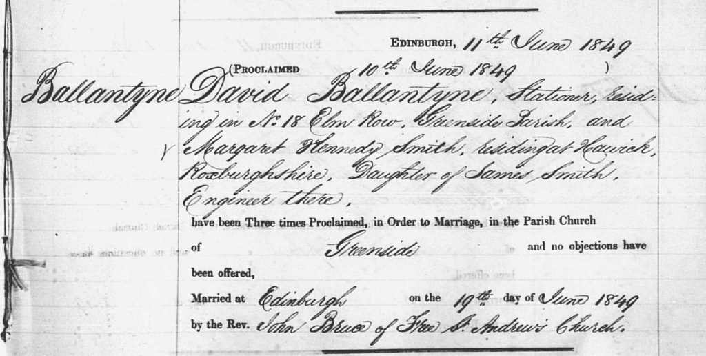 I was pretty sure that I had interpreted the rest of the information correctly. That they were married in the parish church of Greenside in Edinburgh by the Reverend James Bruce of the Free St Andrews Church, but then I re-read the notice a few times and I can’t be certain if it is proclaiming that the banns were announced in the parish church of Greenside in order that they could marry in Reverend Bruce’s St Andrews church.