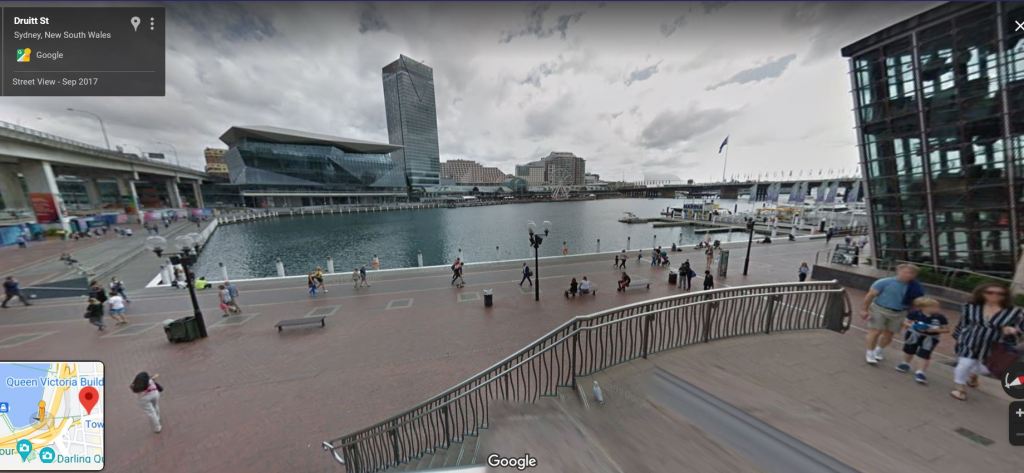 How is this for a fantastic comparison? This is roughly the same spot in 2017, the latest shot Google Maps had of the area. That basically empty stretch of land on the Pyrmont side in the above photo, filled in and gone. I wonder what George would think if you could just transport him from 1899 to this spot today?