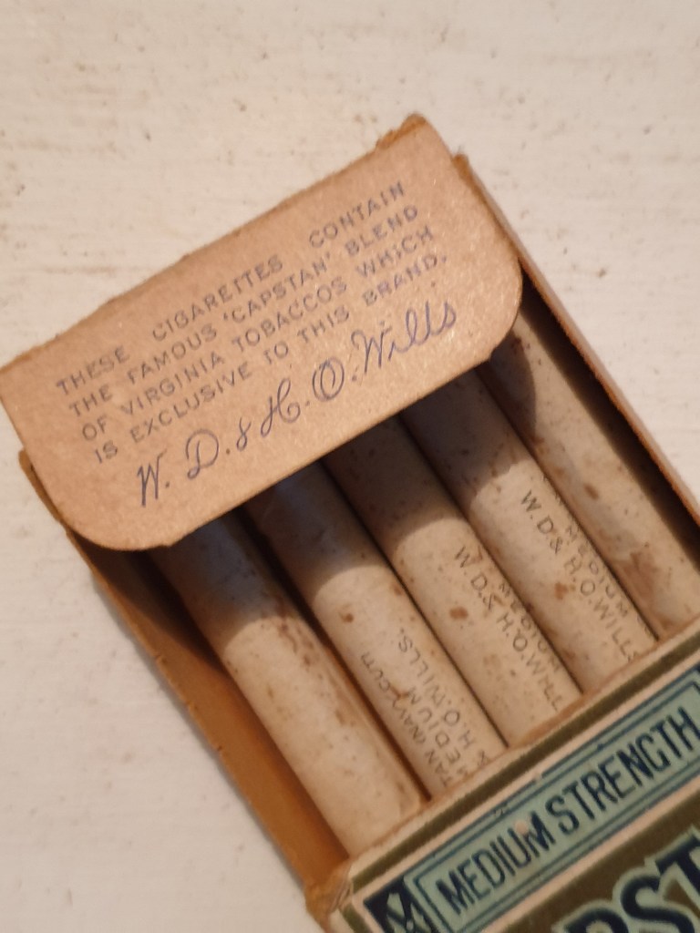 The Capstan cigarettes will I suspect be nearly a century old. Unbelievable that there are still some in the box. They were invented in the mid 1890s and became the most popular selling brand to the working man in the early 20th century. A quick search online and these look like early teens, 20/30’s. Interestingly, Capstan had the highest amount of nicotine in their mix as apposed to any other brand available at the time. https://en.wikipedia.org/wiki/Capstan_(cigarette)