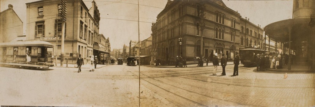 Stephen Court is just set back and has the 4 roof finials on the facade trim. The other interesting thing about the 1904 photo is that it shows the 3 types of trams used in Sydney’s tram history. Margaret Simpson the Curator of Transport at the MAAS (Museum of Applied Arts and Science) explains that the one on the right is a steam tram, the two in the middle are cable and the one on the left is at the time the latest electric type.