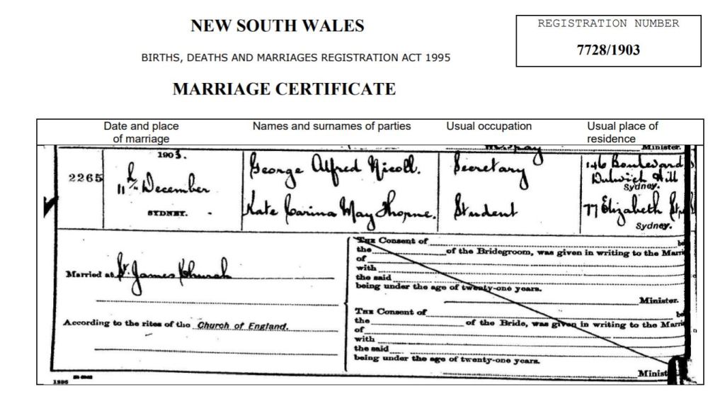 Previous Nicoll weddings had been at the Metropole Hotel in Bridge St or the Independent Order of Odd Fellows banqueting rooms in Elizabeth St. I could imagine they could have been in either establishment, both not being far from the church.