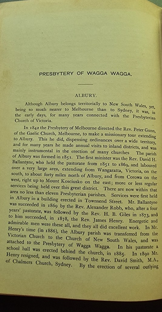 The reason I purchased it? My 3x Great Grandfather, the Rev. David Hunter Ballantyne makes an appearance in it being the first Presbyterian minister in the Albury area back in 1851.