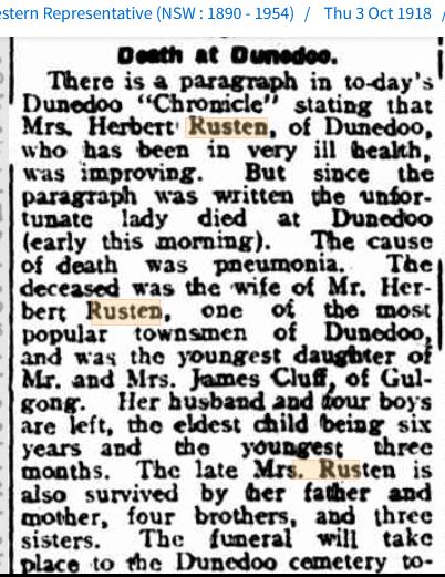 Mrs Herbert Rusten was Beatrice Rusten, nee Cluff. She was only 25 years of age when she passed away and left Herb with four sons aged 6 years to 3 months old to raise.
