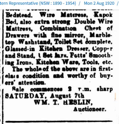 This wasn’t the first I had seen of any information on Joe and Kathleen having a house in Dunedoo. The original article I came across was when they were advertising the sale of all their possessions in 1920 which I presumed was in preparation for a move.