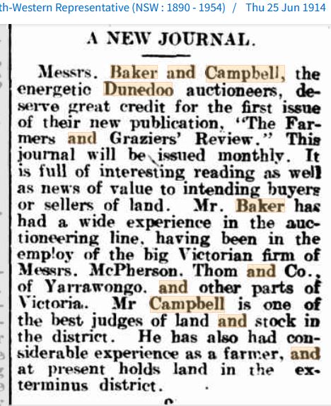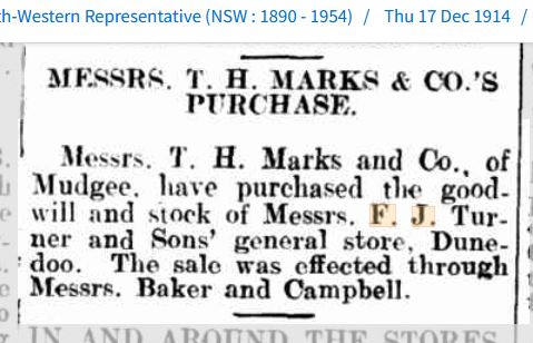 Baker and Campbell whose name is clearly visible in the photo, were land and stock agents. They actually brokered the sale of the old established Dunedoo grocery store of F.J. Turner’s to T.H. Marks and Co in 1914. Remember Joe worked for T.H. Marks in Mudgee.