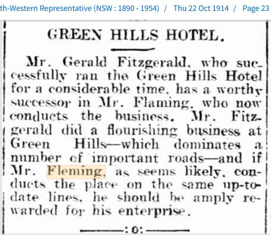 This information about Mr. Fleming enables us to date this photo of the Green Hills Hotel with some confidence between the end of 1914 when Mr. Fleming takes over the license and 1922 when George Ashton passes away.