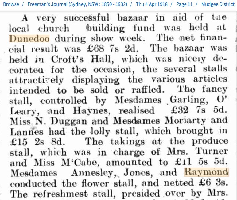 I have searched, and I can’t find another family of Raymonds living in Dunedoo at the time, so I’m claiming this is our Kathleen and Joe. I spoke to my Uncle Peter, Kathleen, and Joseph’s grandson, and he said that he remembered his mum talking about his Grandparent’s house at Dunedoo.