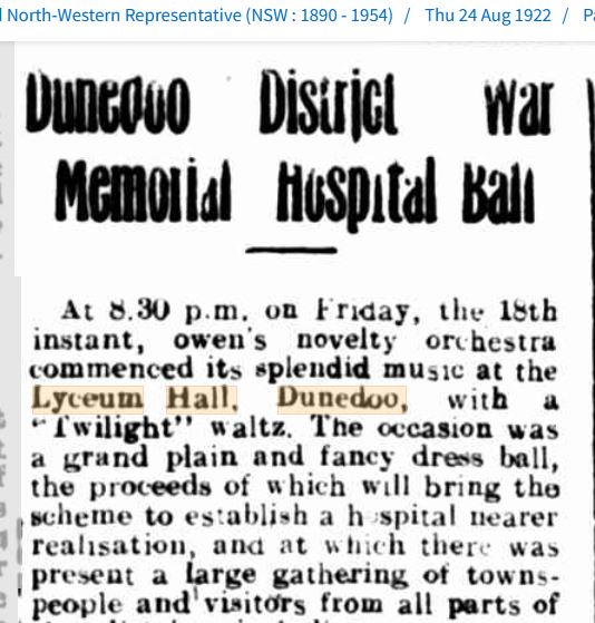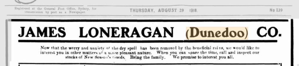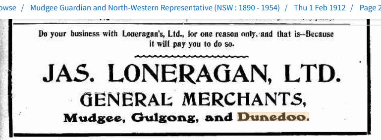 Another piece of information I have had trouble confirming is where the actual site of the Loneragans store was in Dunedoo where Joe was working. There are only a smattering of advertisements for the store on Trove but again, like so many ads of the time, there is no location or street address mentioned.