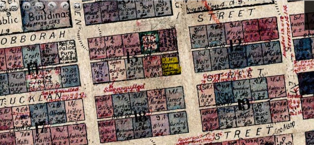 Well, this is great, the initials fit with Joseph’s full name, Joseph Henry Raymond. The only fly in the ointment for my reasoning here that it is Joe and Kathleen’s property, is that the first map is dated from 1910. We know so far that Joseph is still in Sydney in 1910 when his mother dies. Perhaps Joe saw the For Sale flyer depicted in Figure 11a above and acted to secure some land near the woman he intended to marry. Remember we still don’t know when he and Kathleen meet. Maybe they already knew each other before 1910.