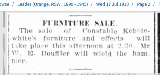 Presumably, circumstances didn’t improve, as 11 months later, Alfred resigns from the Police on the 16th of July. The next day, he is advertising the sale of all their possessions, probably in preparation for the move to Sydney.