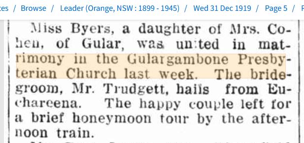 After Herbert’s death by the lightning strike, Margaret and the children make it back to Green Hills and she marries George Cohen in 1910 becoming Mrs Cohen as mentioned above. And there is her previous married name, Byers, of course, her daughter’s name and not just Gulargambone but more specifically, Gular, the place of residence marked on Kathleen and Joe’s marriage registration. So I think I might be right about why Kathleen and Joe were in Gular.