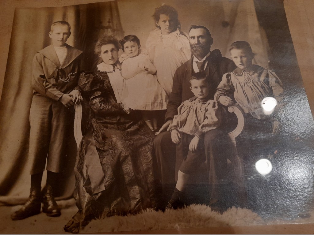 (Gordon, Jean, Douglas, Christina, James Snr, James Jnr, and Robert standing in front of his Father.)