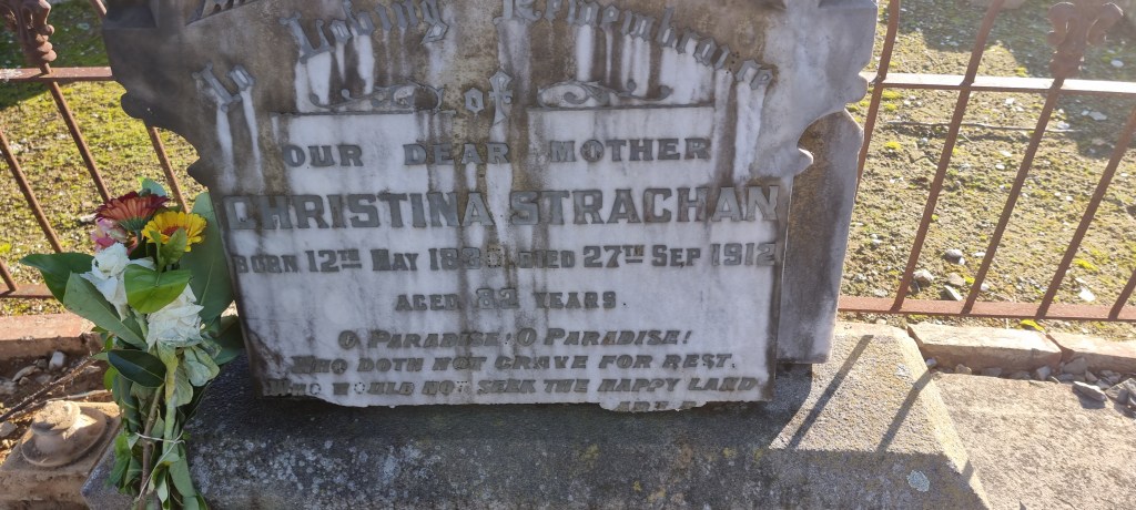 The photo also shows Aunty Marj’s cousin, the father of Margaret above. He is the young boy standing on the left, Gordon Ross. Gordon’s mother, Jean Ross, nee Strachan (seated next to him), and Aunty Marj’s grandmother, Agnes Cox, nee Brookman (my 2x great-grandmother) are half-sisters. Christina Strachan, my 3x Great-grandmother, who you will remember I shared her headstone with you earlier in the post, is their mother. You got that? There will be a short quiz at the end.