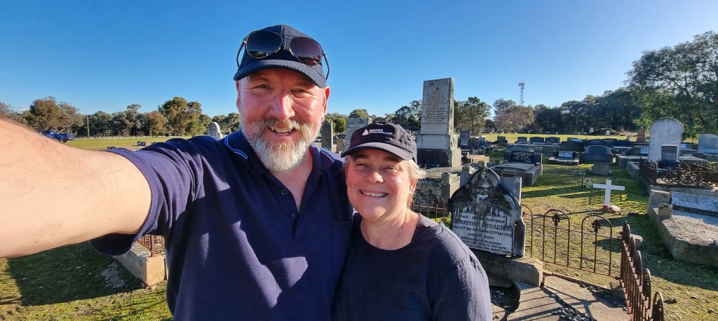 The reason I look dishevelled is that we had been cleaning up the grave site of my 3x Great-grandmother, Christina Strachan Brookman nee Russell, Agnes’s Grandmother. (Yep, poor Alex, It was a big weekend of Macvean Ancestors) I discovered Christina was buried there in Holbrook a number of years ago but this was the first time we were able to visit.
