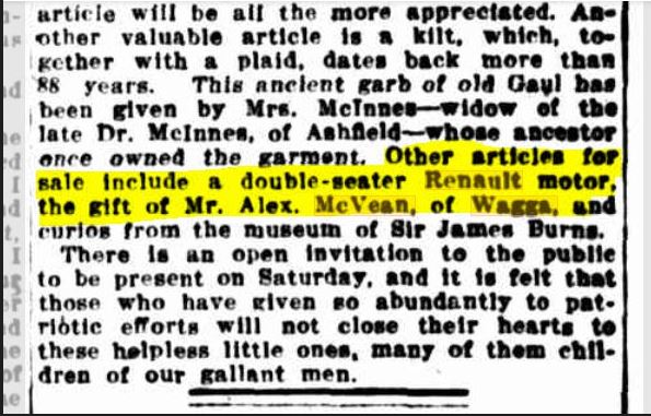 Jeremy knows his cars, I can’t wait to let him know. I mean how fantastic is that? I had been searching with, “car, Mcvean, and Wagga” and only found the one article above about Jessie loaning the vehicle to the Ladies Charity Committee, this little find confirms that it was indeed a Renault they had and what a gift to make to the Burnside Homes.