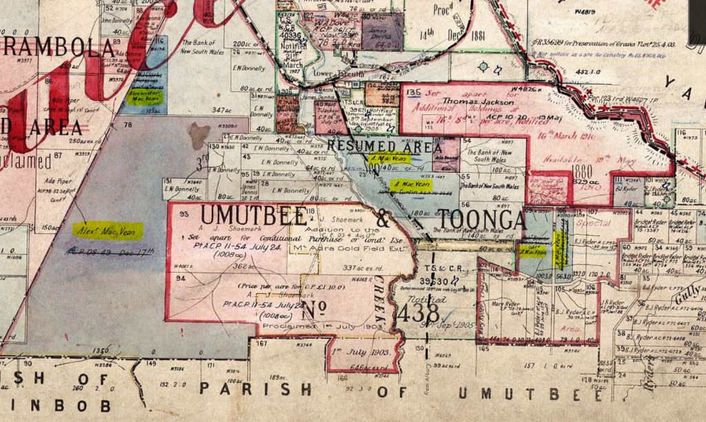 Lower Tarcutta from the first article is great, you will see it in very small print on the first map below “Lower Tarcutta“, just down from the top in the center of the map. You’ll note also the parcels of land on the map with Alexander’s name on them, denoting which ones belonged to Jessie and Alexander.