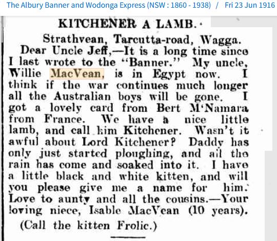Obviously, the family was keeping up to date with what was happening to William. Here is Isabel in Tarcutta mentioning, just like her cousins in Germanton, her Uncle William, affectionately referred to here as Willie. It is sad to think that a 10-year-old Isabel is worried that all the young men will be gone because of the war.