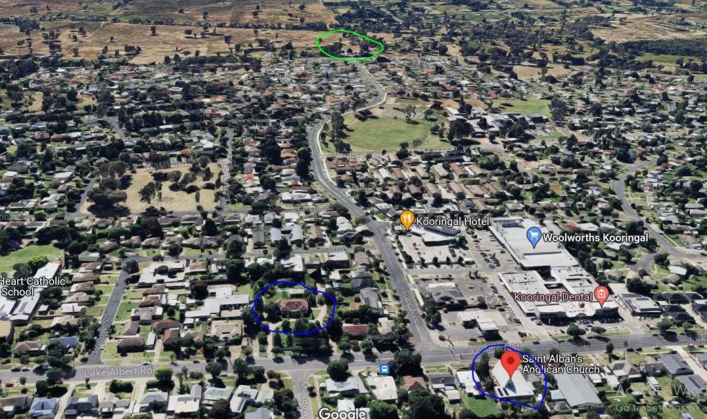 In the foreground, which I have circled, is St Alban’s church and also the large property to the left of it, which are clearly visible in the 1960s photo and whose sites match perfectly with this Google 3D map. And there in the distance is 525-529 Kooringal Road sitting exactly where we would expect to find Section 68 on the Land Registry map and Kooringal the Homestead.