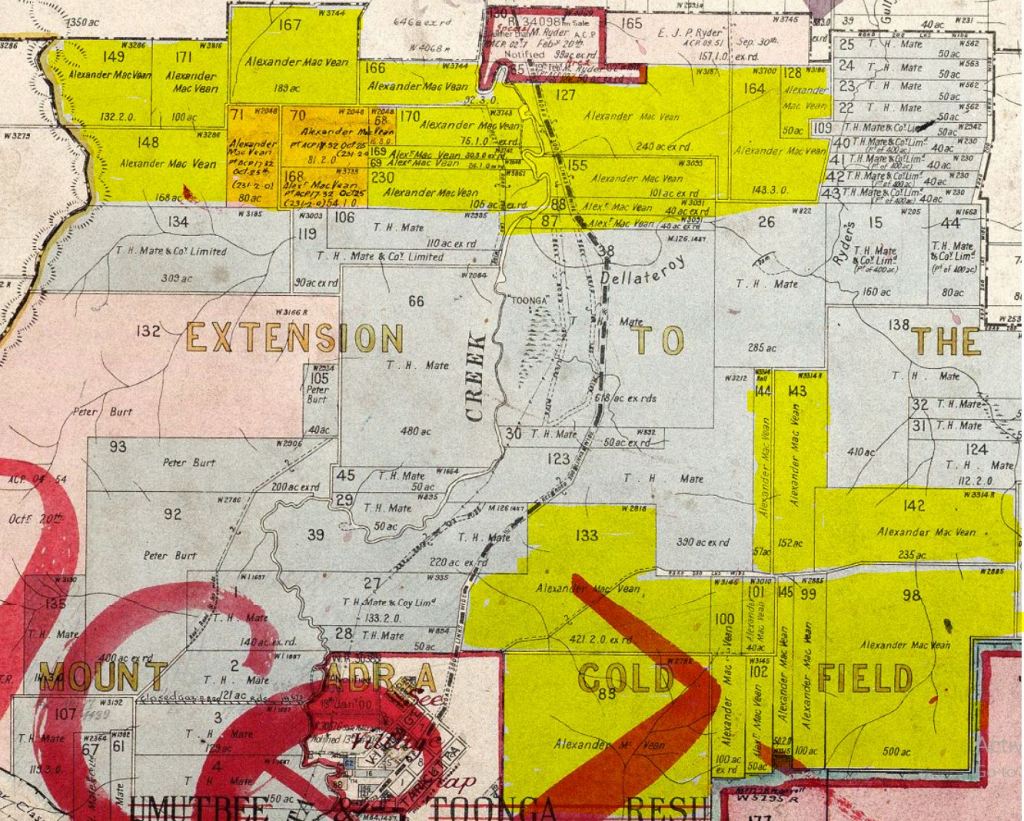 And then how convenient, to finally confirm it for us is the name “Dellateroy” written just under the parcels of land I have highlighted. It is a little misleading for us as it isn’t written on those highlighted parcels, but I think it was probably noted there when the land holding was larger before being subdivided. Just like Jessie and Alexander did with Kooringal.