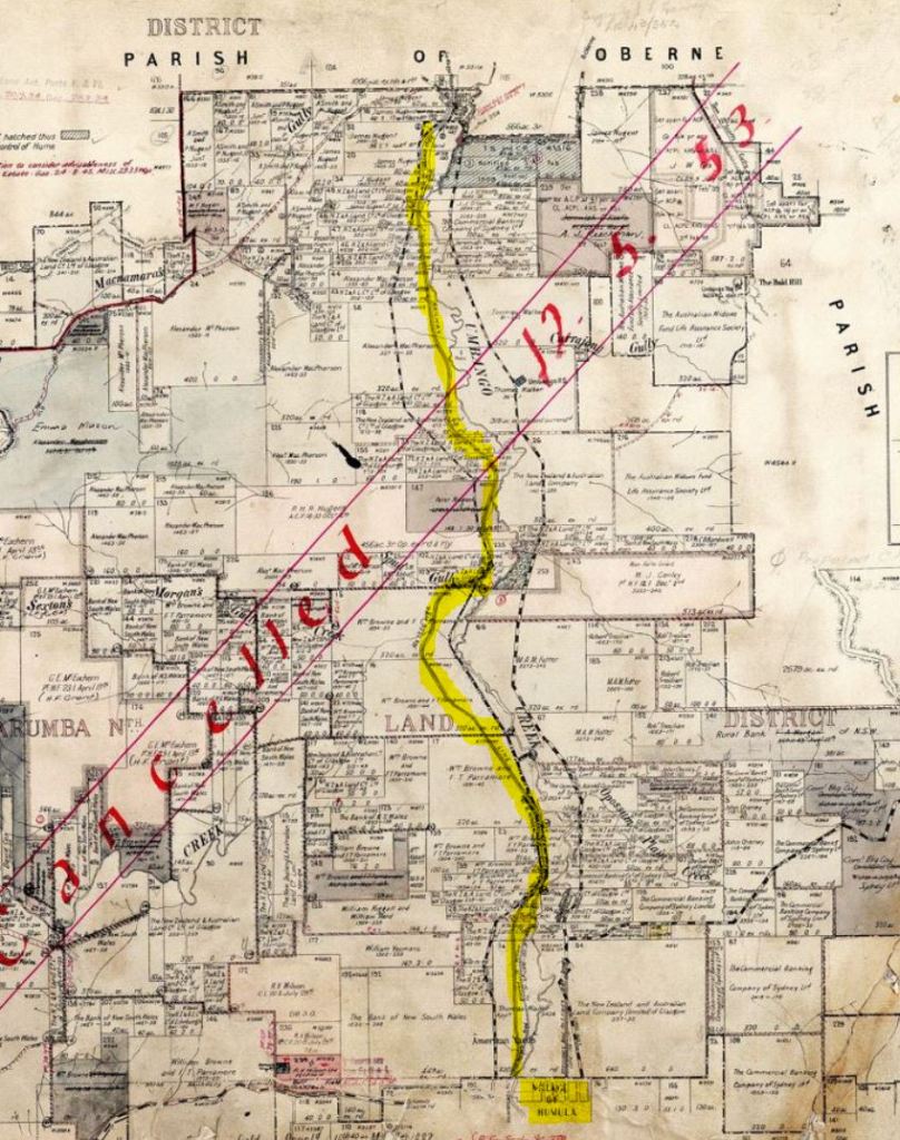This is where the second article above assists us in confirming this is Deletroy, the double frontage on the Tarcutta Creek. You can see that in the map below parcels 166, 127, 170, 155, 169, 230, 88, and 87 all front onto the creek from either side.