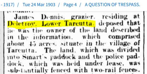 After reading Robert’s death notice I decided to see if I could track down exactly where Deletroy was situated. I’m pretty sure I found it. I was very lucky I uncovered a couple of articles on Trove giving us some markers as to where it was situated.