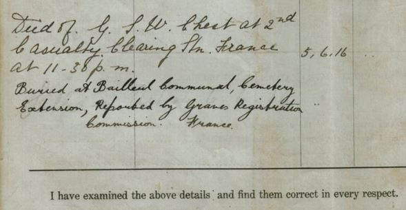 This is the notation in Robert’s service record describing his death as a result of a gunshot wound to the chest.