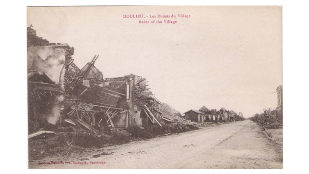 This is where Jack was admitted when the 3rd AFA was set up in Doulieu. I can’t find a photo of its actual site in Doulieu but amazingly I found one of the Allied Camps in Strazeele and I’m making the assumption here that 3rd AFA was probably here before it moved. I also found a couple of photos of the church and the village of Doulieu showing the destruction they were all living and working in.