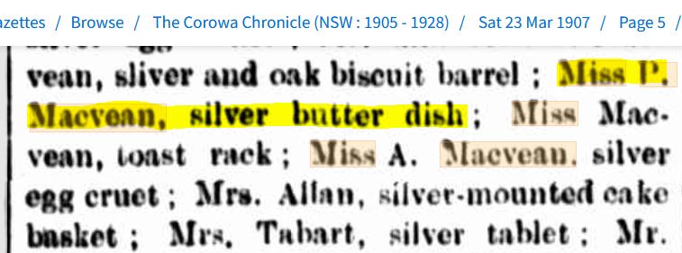 Yeah, I know, mistake again. Her husband named John and not Allan. Perhaps the court reporter was aware of Allan’s brother, the squatter, John Macvean and transposed his name instead.