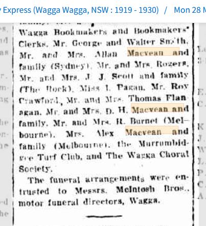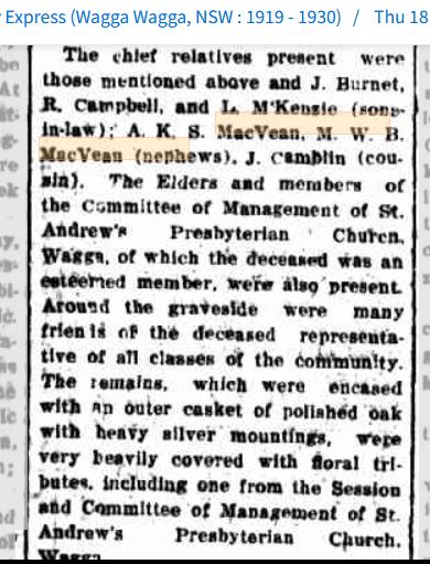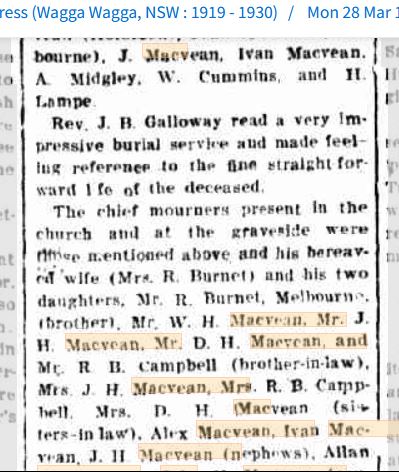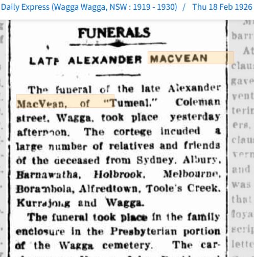 The next family gathering that I think John, my grandfather attended was the funeral of his step-grandmother, Kate Macvean. Just 18 months after his father’s funeral and this time in Wagga Wagga.
