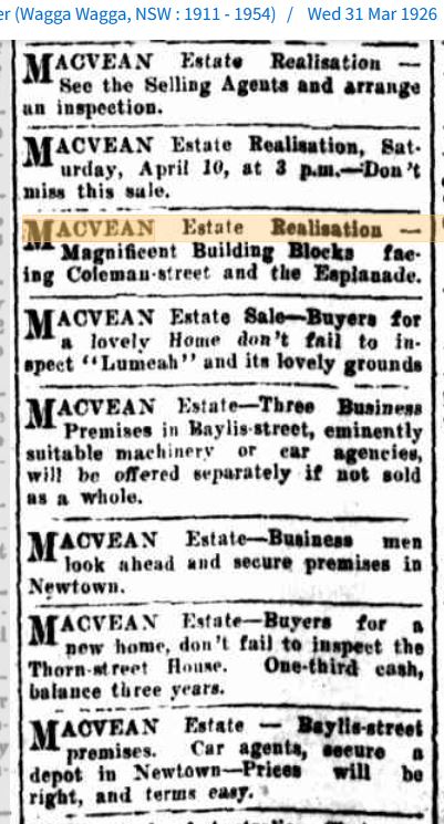 Now things must have moved quickly once Alexander passed away, here is a listing for what I can only imagine must have been for the sale of some of the land holdings that he had in Wagga Wagga. This is just a month after he died.