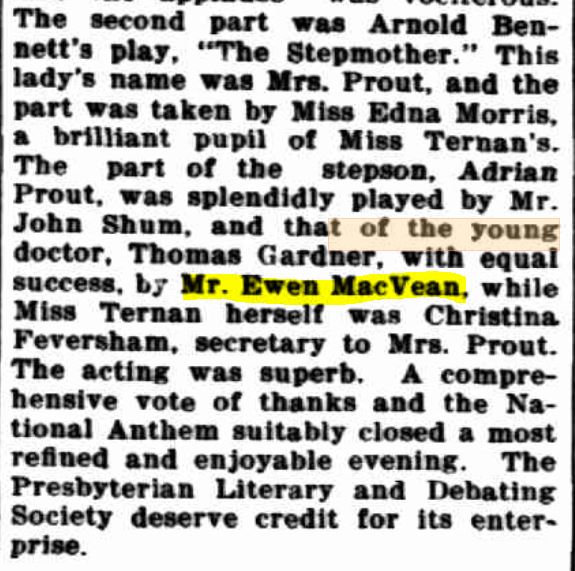 Ewen’s performance career didn’t start here, either. I found another mention of a play that he was in from 1927 at the Box Hill Recreation Hall. The play was called “The Stepmother” by Arnold Bennett.