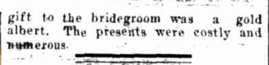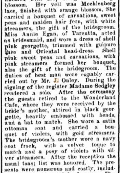 We have another issue with the wedding party photo. The other bridesmaid is named as Florence Christina Bromham but the article states that it was Mary’s cousin, Miss Taenie Patterson. I think this might be referring to Christina Alice Patterson, daughter of Mary’s mother’s sister, Catherine Robertson and her husband Mark Patterson.
