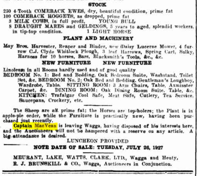 I wonder if this next article was Jack getting ready for city life with Ellen. It is a for sale listing for all of his property and household goods used at “Concudgery”, his station at Coreinbob, a month before the engagement announcement to Ellen.