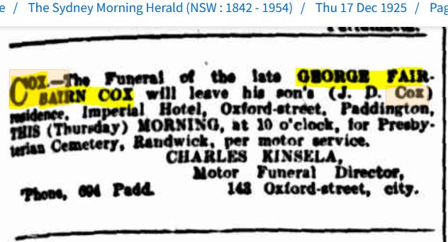It is interesting to note that John died at a property called “Woodlawn” in the town of Quirindi, 400 km north of Sydney but is buried in South Head General Cemetery in Vaucluse, Sydney.