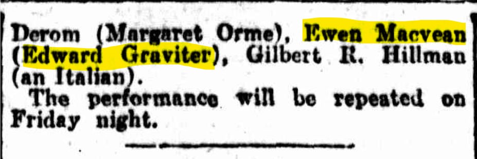 So we can see from the cast list above that Ewen was playing “a Solicitor” named Edward Graviter. Now, there is no way to know if my grandfather or any other members of the family attended the show, but it is great to imagine they did.