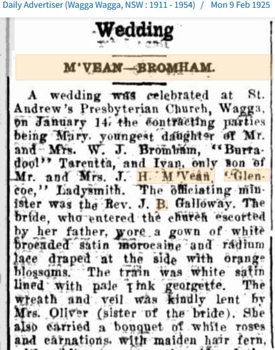 Next, we have another wedding on the calendar of family events and this time it is my grandfather’s cousin Ivan Laurence Macvean and his marriage to Miss Mary Bromham.