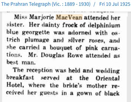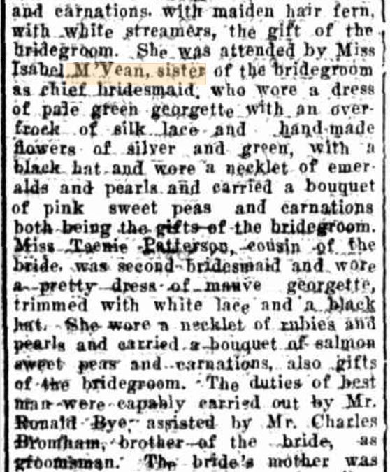 Next, another wedding. This time, it was my grandfather’s other cousin, Isabel, sister to Ivan Macvean, who married Mary Bromham in “Article 2” above.