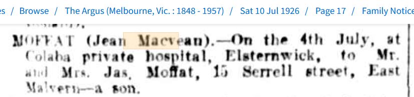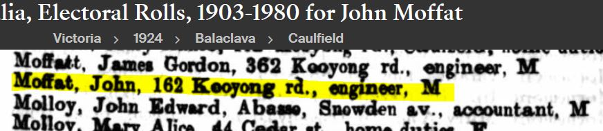 I can’t find the link between them all but I wonder if one of the Moffat brothers rented one of those rooms that my great-grandmother was renting out in their house on Kooyong Road?