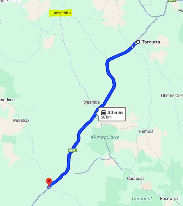 Just to give you an idea as to where Concudgery was here it is marked on the map below. It is at the end of the blue line there heading from Ladysmith, that is Coreinbob Road and 17.8kms is roughly 11miles from there as stated in the ad above.