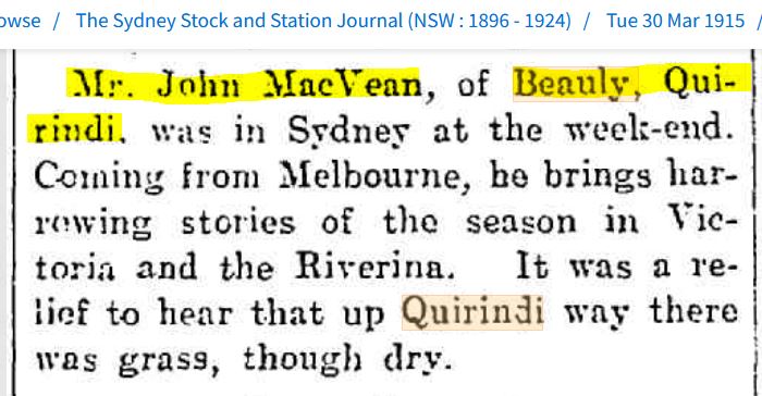 “Beuley Station, near Quirindi…” This was the key. So they weren’t actually in Quirindi yet, but near it, on Beuley Station. The station actually featured prominently in the trove of information I uncovered. A few examples below.